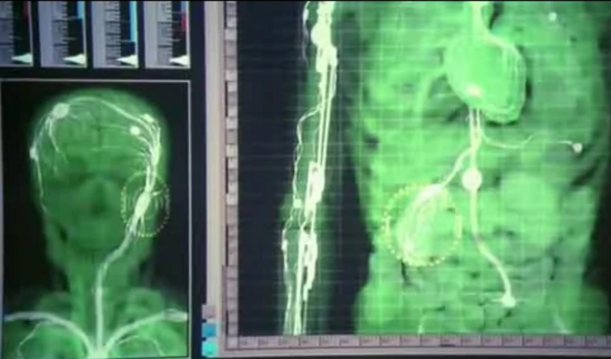 Scans showing nanoprobes modifying the internal organs.